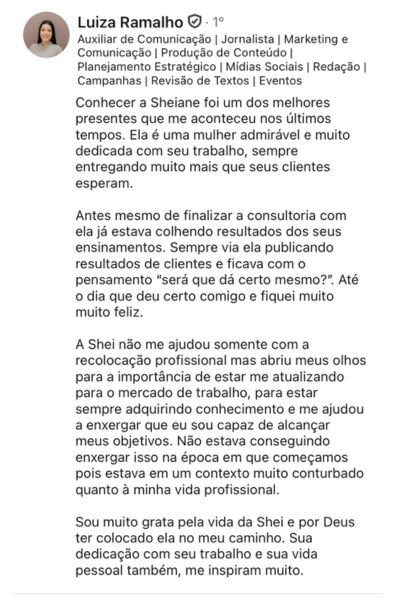 Empresária desde 2020, atuando como Mentora, Palestrante, Consultora de Carreira e Empresarial, desenvolvimento de líderes e empresários, com mais de 1800 alunos e 23 empresas atendidas.