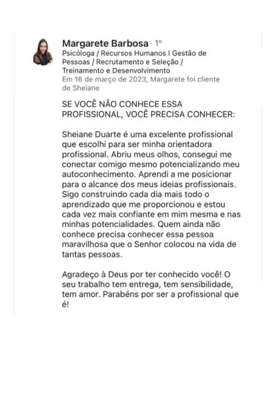 Graduada em Recursos Humanos, Pós-Graduada em Gestão Estratégica de Pessoas e Liderança, Técnica em Master DISC Mapeamento Comportamental. Destaque de RH, na revista ComuniCare Hub, 10ª edição, em maio de 2024.
