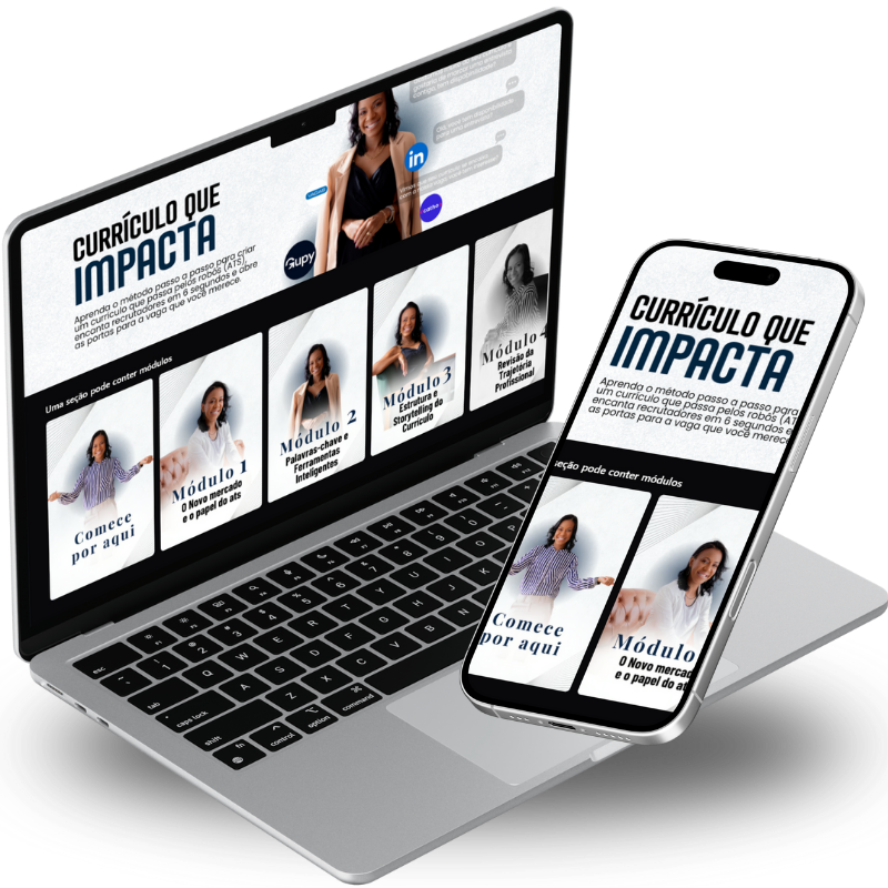 Ao se inscrever, você ganha acesso instantâneo ao método completo “Currículo que Impacta” e à nossa comunidade exclusiva de alunos. Mergulhe em um universo de estratégia e networking com profissionais como você.